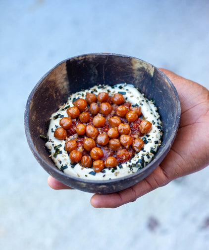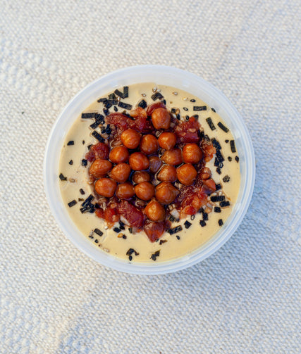 This flavor is exploding with umami! Silky hummus is layered with a chutney of sweet, tangy roasted tomato & pomegranate. Topped with chickpeas coated in a chickpea miso glaze (whoa!) & a sprinkling of vegan furikake. Inspired by a trip to Koda Farms.