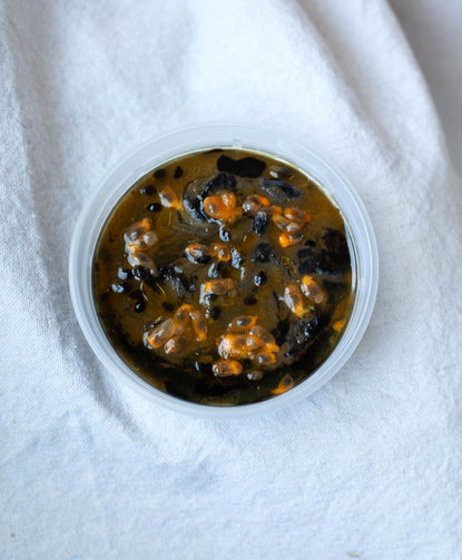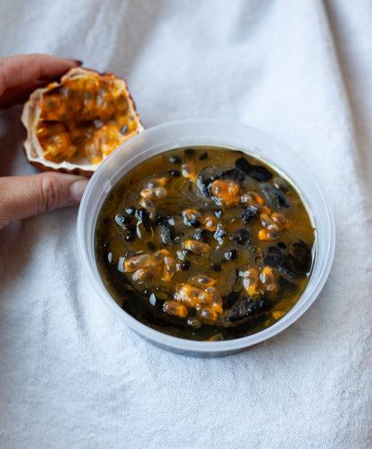 Fresh local tangy passionfruit (including their silky, crunchy edible seeds), drizzled on top of luxurious black sesame tahini hummus. Lightly sweetened with honey & embellished with infused thyme oil. A dark Halloween treat -- boo!